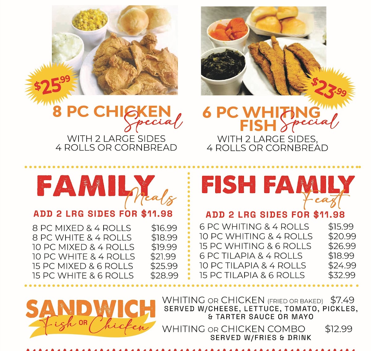 6 pieces of whiting fish with 2 Large Sides of your choice and Rolls/Cornbread.