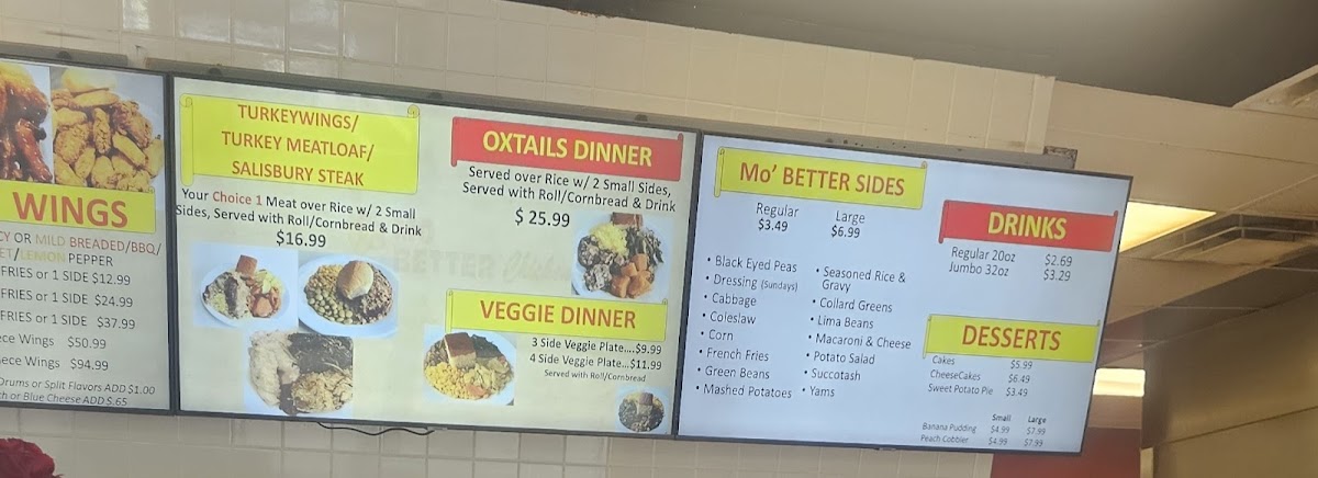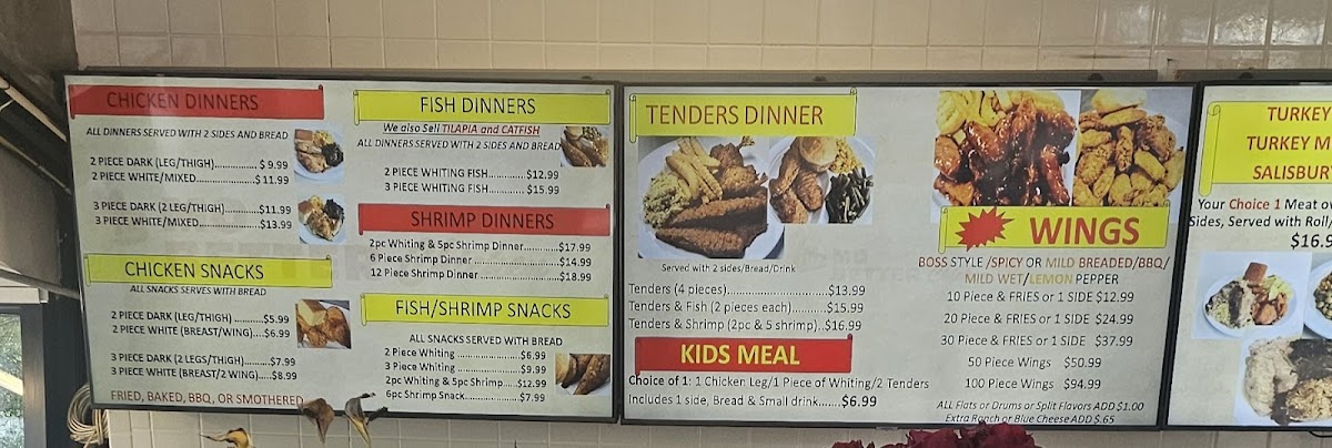 The menu truly shines in its variety of combo and family-style offerings. Wing lovers can enjoy 10 Piece Wings & Fries, 20 Piece Wings & Fries, or 30 Piece Wings & Fries, while larger groups are well served by family specials like 12 Piece Chicken w/ 3 Large Sides & 6 Rolls or Cornbread, 6 Piece Whiting Fish w/ 2 Large Sides & 4 Rolls or Cornbread, and 8 Piece Chicken Mixed w/ 2 Large Sides & 4 Rolls or Cornbread. Comfort-food staples continue with veggie-focused options such as Veggie Plate 3 Sides and Veggie Plate 4 Sides, alongside hearty dinners like Oxtails Served Over Rice w/ 2 Small Sides & Drink, and turkey-based meals including Turkey Wing, Turkey Meatloaf, or Salisbury Steak dinners.